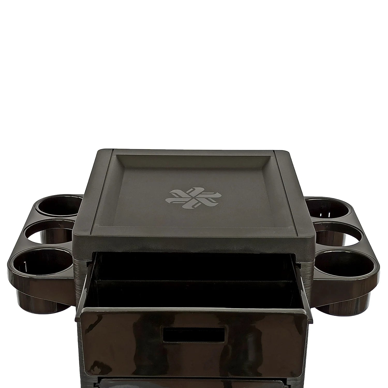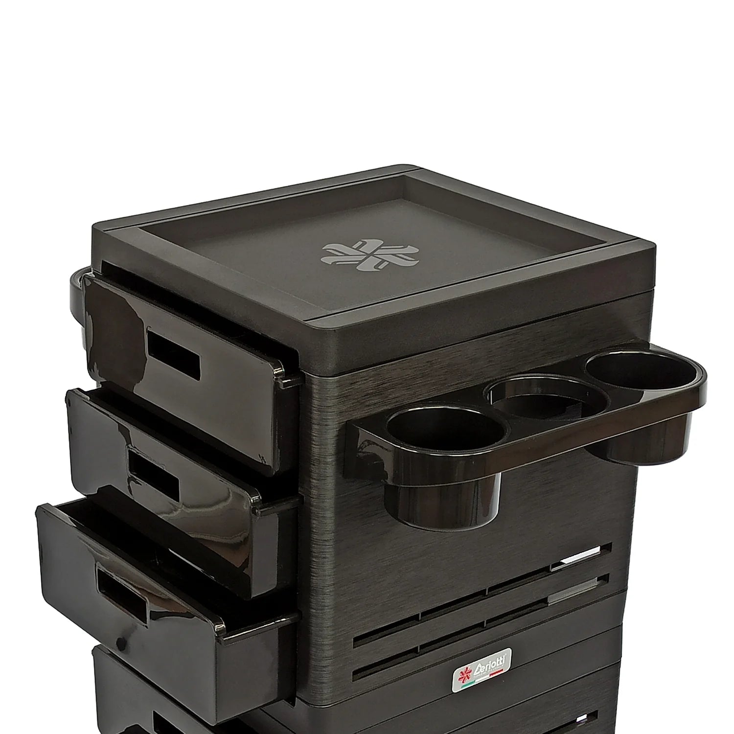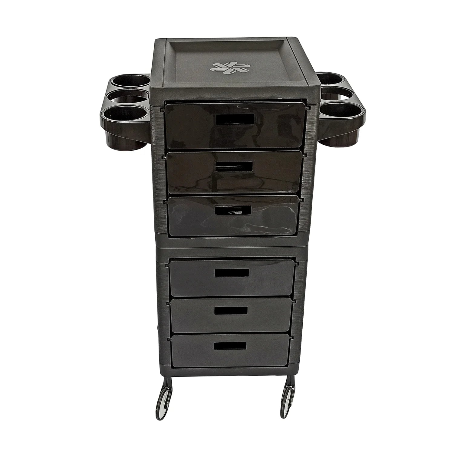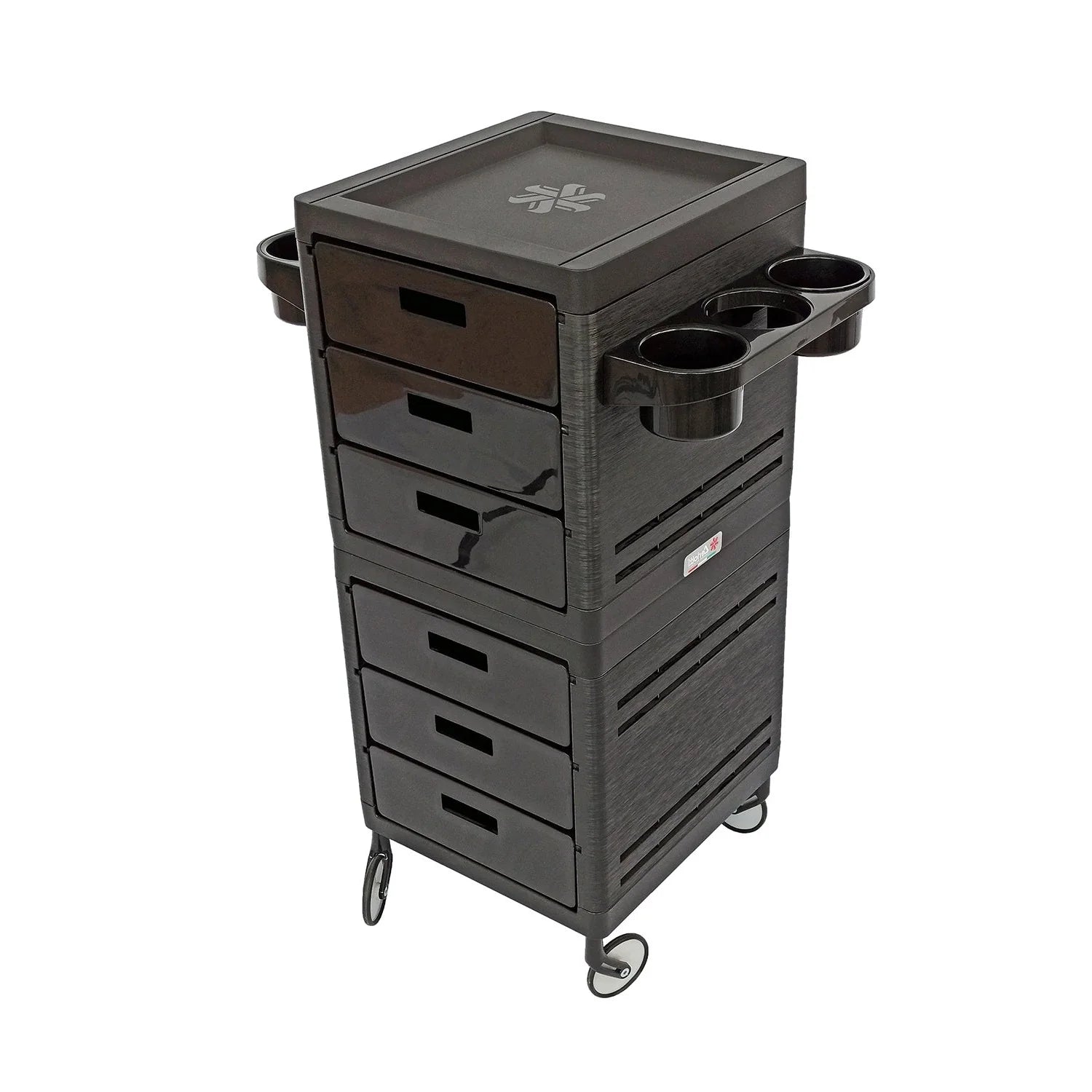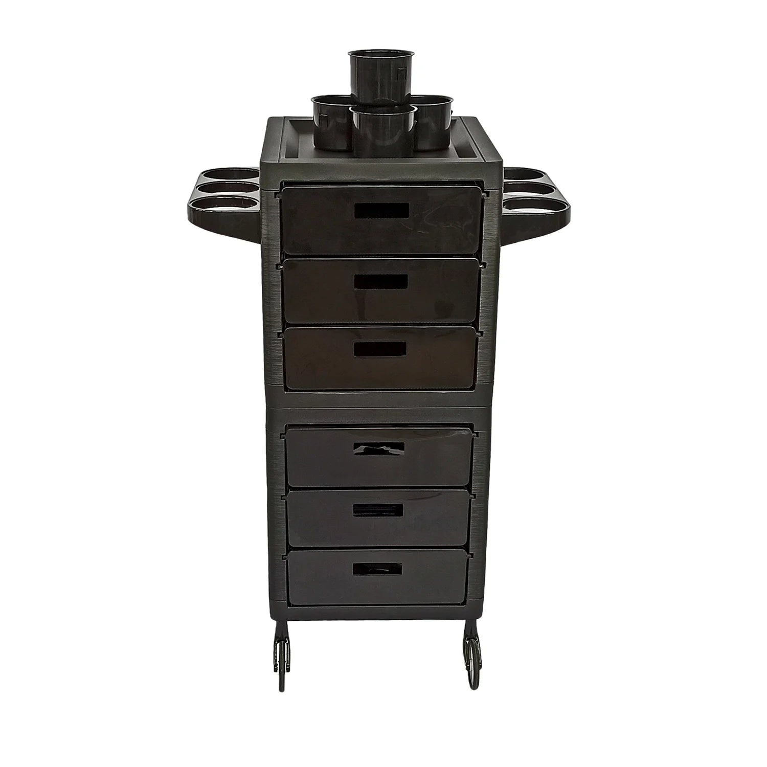 Color negro mate. Plástico reforzado multi funcional con 6 cajones, todos extraíbles e intercambiables. Posibilidad de colgar accesorios en ambos lados. Zonas ajustables para poner tubos, contenedores y secador de cabello.
