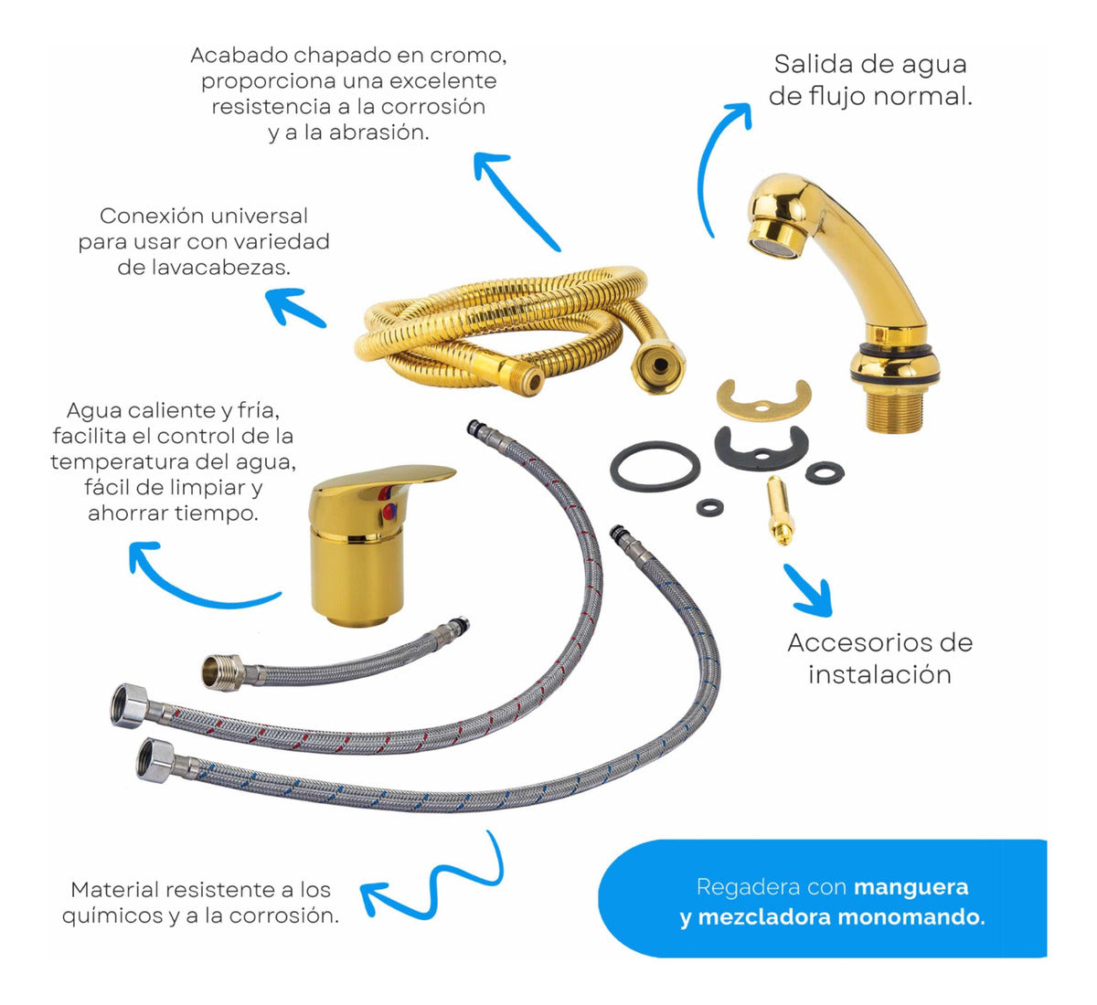 Descubre la elegancia y funcionalidad del Juego D Llave Monomando y Regadera para Lavabo Estéticas Oro de Letmex. Este exquisito accesorio combina un diseño sofisticado con una construcción de alta calidad, ideal para transformar cualquier baño en un espacio moderno y lujoso. Su acabado en oro no solo aporta un toque de distinción, sino que también es resistente a la corrosión, garantizando durabilidad y estilo en el tiempo.El monomando permite un control intuitivo y preciso del flujo y la temperatura del agua, facilitando su uso diario. Además, la regadera complementa perfectamente la funcionalidad del lavabo, ofreciendo una experiencia de uso cómoda y eficiente. Cada detalle ha sido cuidadosamente diseñado para satisfacer las exigencias de quienes buscan calidad.Este conjunto no solo embellecerá tu espacio, sino que también es la elección perfecta para aquellos que valoran el estilo y la practicidad en su decoración. Mejora la experiencia de tus visitas y haz de tu lavabo un lugar donde la elegancia y la funcionalidad se encuentren en armonía.Garantía de fábrica: 12 meses