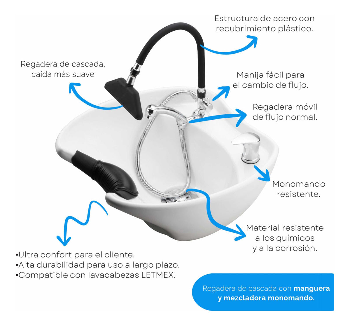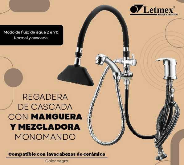 Regadera de cascada con manguera y monomando para lavabos de estéticas y barberías Mod. Letmex 911SET**NO INCLUYE LA TARJA**Regadera tipo cascada con manguera y monomando con modo de flujo 2 en 1: Normal y CascadaEstructura de acero con recubrimiento de plásticoMaterial resistente a los químicos y corrosiónIdeal para Estéticas, Barberías, Peluquerías y todo espacio que tenga un mueble compatibleSe puede usar con flujo tipo cascada o chorro normalAlta durabilidad para uso a largo plazoResistente y estableManguera fácil de maniobrarUltra confort para el clienteUniversal para lavacabezas LetmexGarantía de fábrica: 12 meses