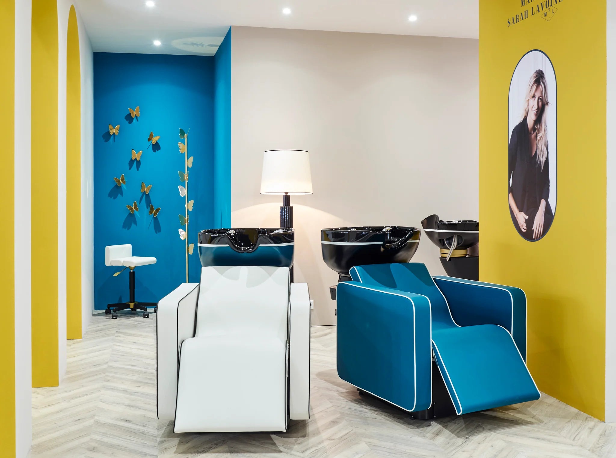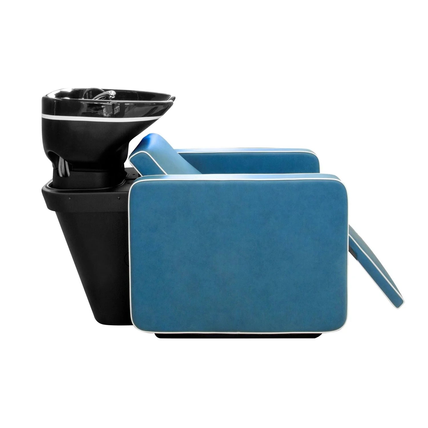 Lavacabezas combinable con sistema de vapor. Inclinado de cerámica negra brillante o tricolor. Reposapiernas con elevación eléctrica. Masaje de aire. Sillón con estructura de madera contrachapada con inserciones de espuma de poliuretano, reclinable para facilitar la inspección.
