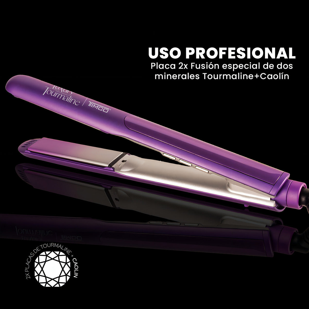 Plancha de cabello profesional con Micropartículas Termoprotect de Caolín.TECNOLOGÍA TURMALINE + THERMOPROTECT DE CAOLÍNLas placas de la Plancha para Cabello están fabricadas con tourmaline, mineral natural que emite iones negativos y calor infrarrojo lejano, lo que permite tener un cabello menos seco, menos encrespado y visiblemente más brillante.SISTEMA TERMOPROTECT DE CAOLÍNLa arcilla natural de esta plancha de cabello absorbe impurezas, es ideal para cabello que se engrasa con facilidad y se ve sucio a las pocas horas de lavarlo, además calma y refresca el cuero cabelludo.Características:Botón ON/OFFPlacas Flotantes 2X tourmaline + Caolín 2.5 cmPantalla digital que indica cuando se ha alcanzado la temperatura deseada5 niveles de temperatura 300 °F – 450 °F - 150 °C - 230°CBloqueo de las placas para mantener cerrada la plancha cuando no se está utilizando.Generador de IonesCable giratorio 360°