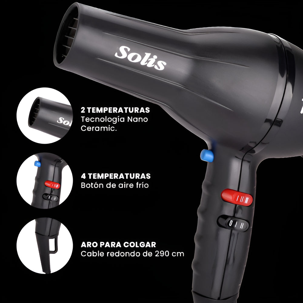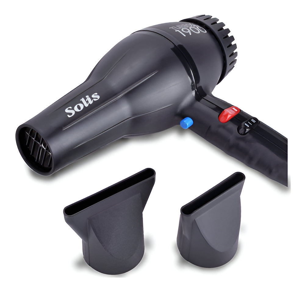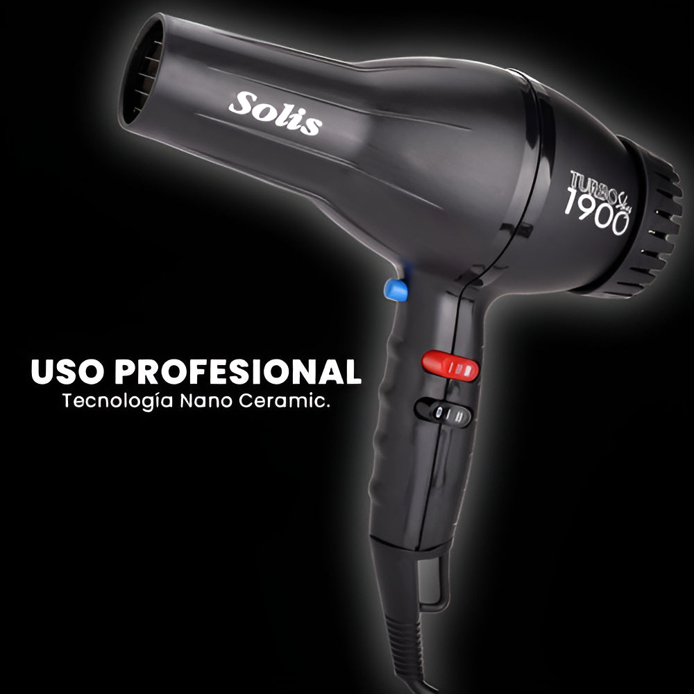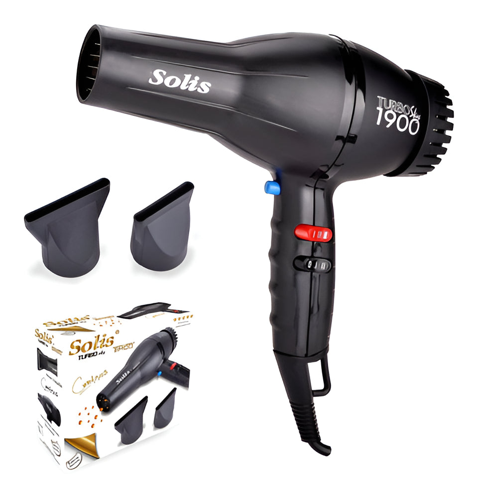 Un producto que no puede faltar en un tocador o salón es la secadora de cabello y Timco® lo sabe, es por tal razón que se han dedicado a fabricar una gran variedad de modelos para que puedas adquirir la secadora que mejor se adapte a tu presupuesto y necesidades.Uno de los modelos profesionales más buscado es la secadora Solis By Timco® STS-1900, su potente motor de larga duración, excelente flujo de aire y su tecnología nano ceramic la convierten en una de las mejores secadoras, dicha tecnología permite cuidar del cabello sellando la cutícula, dando brillo y controlando el friz.Características• Modelo STS-1900.• Aprobada por los profesionales.• 1900W.• Alámbrica (corriente directa).• 125v.- 60 Hz.• Cable redondo con clavija normal (americana).• Agarre ergonómico.• 4 Temperaturas.• 2 velocidades.• Botón de aire frío.• Carcasa plástica.• Pesa 844g. (aprox.)• Tecnología Nano Ceramic.• Filtro removible.° Medidas °• Secadora 20cm. de alto, 23 de largo, mango 12cm.• Boquilla de secadora 4.5cm. de diámetro.• Cable 2.87m.• Producto completo 27.5cm. de largo, 23cm. alto, 9cm. de ancho, 1.02kg.Incluye• Secadora STS-1900.• 2 Boquillas.